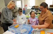 Tatjana (von links),Marc, Asra und Sandra experimentieren im Wasser mit verschiedenen Bootsmodellen. Nur eine von zahlreichen Stationen, die die Grundschüler/innen im Rahmen des „Mint-Projektes“ durchliefen.