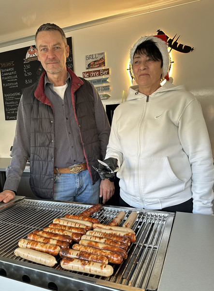 Dieter Schramm (rechts) übergab an Tobias Ortmann und Steffi Werres eine Spende von 1.300 Euro an die Arche in Diepholz. Ein Tagestreff und Beratungsangebot für Menschen, die sich in schwierigen Lebenslagen befinden. Unten: Die leckeren Bratwürste von Dieter Schramm fanden reißenden Absatz!